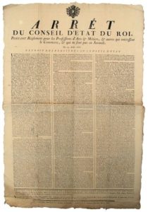 BOURGOGNE. 1767. ARTS & MÉTIERS. « Arrêt du Conseil d’Etat du Roi portant Règlement pour les PROFESSIONS D’ART & MÉTIERS, & autres qui intéressent le Commerce, et qui ne sont pas en Jurande – du 23 Août 1767. « Tous Marchands vendant par poids & mesures… qui s’établiront dans les faubourgs enclos & Banlieue de PARIS, dans les Villes, Bourgs, Bourgades où il n’y a pas de JURANDE… seront tenus de se faire recevoir & prêter serment pardevant les juges du lieu… » signé PHELYPEAUX – Vignette – Imprimé à DIJON (21) chez Causse. Placard (68 x 47) Etat B