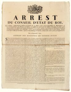 BRETAGNE. 1772. DOUANE. MARQUE DES TOILES. RENNES (35). « Arrest du Conseil d’Etat du roi, qui ordonne, conformément à l’Arrêt du conseil du 23 Mars 1738, que les Inspecteurs des Manufactures & les Commis préposés à la Marque des Toiles, ne puissent en aucun cas, être intimés à l’occasion des saisies qu’ils auraient faites ; & défend aux nommés Guillaume & Yves Carré, de faire, en exécution de l’Arrêt qu’il ont obtenu au Parlement de RENNES, le 7 Septembre 1772, aucunes poursuites ni procédures contre le sieur Fleury, Préposé à la Visite & marque des Toiles, à peine de tous dommages & intérêts, & sous telles autres peines qu’il appartiendra. » PHELYPEAUX – à VERSAILLES le 30 Septembre 1772. suivi de l’Ordonnance de Guillaume Joseph DUPLEIX, Chevalier, Seigneur de Bucy, Bacquencourt, Conseiller du Roi, Maître des Requêtes, Intendant & Commissaire en la Province de BRETAGNE, Fait le 9 Octobre 1772. Vignette Royale. Impr. à RENNES (35) , chez la veuve François VATAR, Imprimeur du Roi et du Parlement. 1772. Placard (51 x 40) État B.