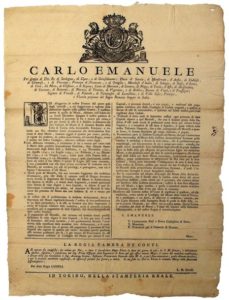 1774. (SAVOIE). CHARLES EMMANUEL Roi de Sardaigne, de Chypre, et de Jérusalem, Duc de SAVOIE. Vignette à ses Armes et Lettrine. LA REGIA CAMERA DE CONTI. Ordonnance daté de Turin le 27 mars 1774. Impr. à TURIN. En Italien. Placard (48 x 35) État A