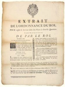 LE MARÉCHAL DE CLERMONT TONNERRE EN DAUPHINÉ. 1778. Extrait de l’ordonnance du Roi, pour régler le Service dans les Places & les Quartiers. » signé (impr.) LOUIS XV & Le Duc de CHOISEUL, à VERSAILLES le 1er Mars 1768 (de l’ouverture & de la fermeture des Portes ; De la Police des Places.) & Ordonnance de Charles Henri Jules de CLERMONT, Comte de CLERMONT-TONNERRE, Seigneur de Thillot, Poncet, Chavannes, & autres lieux, Lieutenant Général des Armées du Roi, Commandant en chef en Dauphiné, en l’absence et sous les ordres de M. le Maréchal DUC DE TONNERRE. Fait à GRENOBLE (38) le 26 Août 1778 – Vignette du Dauphiné & Lettrine. Impr. à GRENOBLE, de l’Imprimerie Royale, 1778. Placard (50 x 37) État A