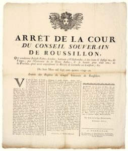 1781. ROUSSILLON. EMPOISONNEUR. « Arrêt de la Cour du conseil Souverain du ROUSSILLON, qui condamne Joseph FABRE, CORDIER, Habitant de VILLEFRANCHE, à être battu & fustigé nu, de Verges, par l’exécuteur de la Haute Justice, & le bannit à trois ans, de la Province, pour avoir empoisonné la Rivière de CORNELLA EN CONFLANT ; & C. » – du 8 Mars 1781 – Donnée à PERPIGNAN (66) le 12 Mars 1781 – Vignette Royale – Impr. à Perpignan, chez REYNIER, imprimeur du roi & du Conseil Souverain du Roussillon, rue des Marchands. Placard (53 x 45) État A.