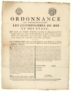 1781. LANGUEDOC. “Ordonnance de Nosseigneurs Les Commissaires du ROI et des États, qui enjoint aux Greffiers-Consulaires de faire les changements sur les COMPOIX (Compoix-Terrier ou Brevette lors des mutations des fonds de terres) sans rien exiger des contribuables; de délivrer gratis les expéditions des Délibérations qu’ils feront pour l’usage des Communautés,...”. Fait à MONTPELLIER (34), au Bureau de la Commission, le 23 août 1781. Vignettes royale et du Languedoc. Impr. à Montpellier, chez Jean MARTEL Aîné. Placard (59 x 46) État A.