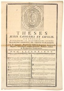 UNIVERSITÉ D’AVIGNON (84). 1782. Grande vignette. Programme de l’examen de Droit pour la Licence – en latin. “Thèses Juris Canonici et Civilis. auspiciis nobilissimi et Illustrissimi Domini Francisci-Josephi de Teste-Venasque...”. Impr. à AVENIONE (Avignon) , chez Chambeau, 1782. en latin - Affiche (50 x 35) État A.