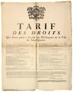 AISNE. 1784. “TARIF DES DROITS qui seront payés à l’avenir aux DÉCHARGEURS de la Ville de SAINT-QUENTIN.” (pour décharger; Muid de vin de Laon, Bière, Barriques d’eau-de-vie Sirop de mélasse, baril de savon-noir, etc.; pour charger; pour descendre; pour monter; Faubourg et Banlieue). Vignette. Fait et Arrêtés en la Chambre du Conseil de l’Hôtel-de-Ville de SAINT-QUENTIN, le 13 mars 1784. . Impr. à SAINT-QUENTIN, de l’Imprimerie de F.T. HAUTOY, Libraire & Imprimer du Roi, 1784. Placard (52 x 41) État A.