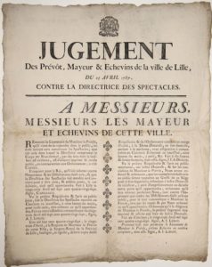 LILLE (NORD) 1787. CENSURE. Placard (52 x 42). « JUGEMENT des Prévôt, Mayeur & Échevins de la Ville de LILLE, du 23 Avril 1787, contre la Directrice des SPECTACLES. » Fait en Conclave le 23 Avril 1787. « … il vient de se répandre dans le Public, un écrit intitulé avis concernant les Spectacles ; que cet avis dans lequel la Directrice compromet le Corps du MAGISTRAT, par des faits dont la fausseté est évidente, est d’ailleurs imprimé & rendu public, en contravention aux Ordonnances ; À ces causes. Il requiert pour le Roi, qu’il soit informé contre l’Imprimeur & les Distributeurs dudit Avis, & que la directrice des spectacles soit mandée au Conclave pour y être ouïe, & ensuite punie… »