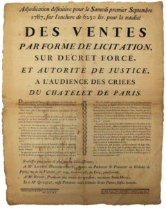NORMANDIE. 1787. PARIS. Marquis de THIBOUVILLE. Adjudication définitive pour le 1er Septembre 1787, sur l’enchère de 6250 Livres pour la totalité des Ventes par forme de licitation, sur décret forcé,.. à l’Audience des CRIÉES du CHÂTELET DE PARIS. De quatre parties de Rentes, saisies réellement sur la Succession & Héritiers bénéficiaires représentant défunt M. Henry de LAMBERT D’HERBIGNY, Chevalier, Marquis de THIBOUVILLE. “..elle est à prendre, par privilège, sur l’universalité des Biens dépendants de la Succession de Messire Pierre-Armand de LAMBERT D’HERBIGNY, Chevalier, Seigneur de MONT-SAINT-JEAN (Normandie), dit d’Herbigny, en Normandie & autres lieux, décédé Maître des Requêtes à Paris,... – Permission d’afficher ce 23 Juin 1787 DE CROSNE. De L’Impr. de la Veuve d’HOURY & DEBURE, Impr. Lib. De Mgr le Duc d’Orléans, rue d’Hautefeuille, près celle des Deux-Portes. Placard (53 x 42) État B