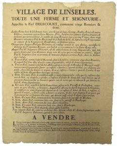NORD. 1788. FIEF DELECOURT. “Village de LINSELLES, Toute une FERME et SEIGNEURIE, appelée le FIEF DELECOURT, contenant vingt Bonniers & demi”. 9 lots avec leurs descriptions. “Tous lesquels Fiefs & Coteries ci-devant dits, doivent reliefs & droits seigneuriaux audit Fief & Seigneurie Delecourt, quand le cas y échoit, À VENDRE . L’on fait savoir que le Mercredi 2 avril 1788... on vendra au plus offrant, .. à l’ Auberge ayant pour enseigne le Mouton, rue St Nicolas à LILLE...”. (Une des dernières ventes de Droits Seigneuriaux). Placard ( 54 x 43) État B.
