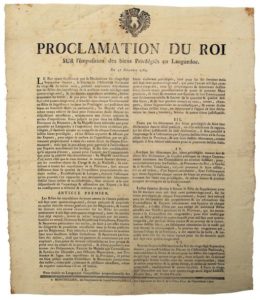 RÉVOLUTION. 1789. IMPOSITION DES BIENS PRIVILÉGIÉS EN LANGUEDOC.. « Proclamation du Roi (Louis XVI) sur l’imposition des biens Privilégiés du Languedoc » « Les ci-devant privilégiés seront cotisés avec les autres contribuables, dans les mêmes proportions & la même forme, à raison de toutes leurs propriétés, exploitations & autres facultés ». à Paris le 27 Septembre 1789 – signé LOUIS XVI & de SAINT-PRIEST. Vignette Royale – Impr. à MONTPELLIER (34) chez Jean François PICOT, Imprimeur du Roi et de la Ville, Place de l’Intendance, 1790. Placard (47 x 40) Etat B.