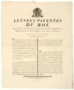 COLMAR (68). 1789. ALSACE. ABOLITION DU CLERGÉ. « Lettres patentes du Roi (Louis XVI), sur un décret de l’Assemblée Nationale, portant qu’il sera sursis à la disposition de tous Bénéfice de Patronage ou Collation Ecclésiastiques, qui ne seront pas à charge d’âmes. ». Données à Paris le 27 Novembre 1789 – Lu à Colmar au Conseil Souverain d’Alsace, le 7 Décembre 1789. Impr. à COLMAR, de L’Imprimerie Royale, 1789 – Vignette Royale – (Le 2 Novembre 1789, les Biens du Clergé sont nationalisés.) Placard (43 x 36) État A