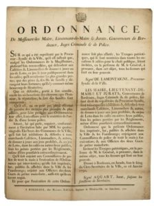 BORDEAUX. 1790. JEU DE LOTO. « Ordonnance de Messieurs les Maire, Lieutenant-maire & Jurats, Gouverneurs de BORDEAUX, Juges Criminels de Police. » Donné à BORDEAUX (33) le 16 Janvier 1790 – « ..Défense à tous Marchands Cafetiers, Limonadiers & autres, de donner à jouer aux jeux prohibés, et au jeu de LOTO dans les Cafés ou autres lieux publics, sous les peines portées par les Règlements… » - Impr. à BORDEAUX, chez Michel RACLE, Imprimeur de l’Hôtel-de-Ville, rue Saint-James, 1790. Placard (52 x 40) État C (consolidations au verso.)