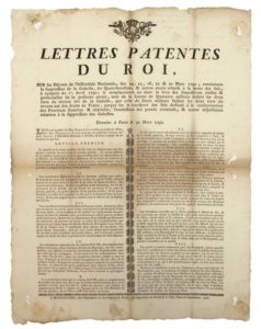 (HÉRAULT). ABOLITION DE LA VENTE DU SEL & DE LA GABELLE (Droits féodaux). 1790 – « Lettres patentes du Roi (Louis XVI), sur les Décrets de l’Assemblée Nationale, des 14, 15, 18, 20 & 21 Mars 1790, concernant la suppression de la Gabelle, du Quart-Bouillon, & autres droits relatifs à la vente des Sels, à compter du 1er avril 1790…., & autres dispositions relative à la suppression des Gabelles. » - Donnée à Paris le 30 mars 1790 – Impr. à MONTPELLIER (34), chez Jean-François PICOT, Seul Imprimeur du Roi & de la Ville, Place de l’Intendance. 1790. Vignette Royale ? Placard (52 x 40) État B (traces d’affichage).