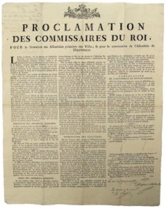GARD. 1790. RÉVOLUTION. L’ASSEMBLÉE PRIMAIRE DE SAINT-AMBROIX (30). « Proclamation des Commissaires du Roi, pour la formation des Assemblées primaires des Villes, & pour la Convocation de l’Assemblée de Département. » - Donnée à NÎMES le 28 Avril 1790 - Vignette - on s’adressera à M. MEYNIER DE SALINELLES à Alais (Alès) Suivi de la Convocation des 384 votants de L’ASSEMBLÉE PRIMAIRE DE SAINT-AMBROIX (30) – Signé autogr. Le Marquis de Clausonnette, Griolet, Meynier de Salinelles. Placard (52 x 41) Etat A.