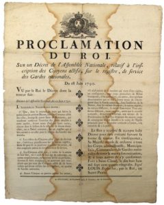 LOIRET. 1790. CITOYEN ACTIF . « Proclamation du Roi, sur un Décret de l’Assemblée Nationale, relatif à l’INSCRIPTION des CITOYENS ACTIFS, sur le registre, de service des GARDES NATIONALES ». Fait à SAINT-CLOUD (92), le 18 Juin 1790, signé (impr.) LOUIS XVI & de SAINT-PRIEST – Vignette Royale. Impr. à ORLÉANS (45) chez Couret. Placard (54 x 42) Etat C (mouillures).