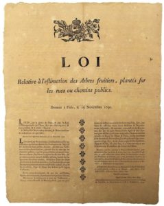 LOIR-ET-CHER. 1790. ARBRES FRUITIERS. Loi relative à l’estimation des Arbres fruitiers, plantés sur les rues ou chemins publics. Donnée à Paris le 19 novembre 1790. Impr. à BLOIS, chez Masson. Placard (45 x 35) État A