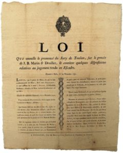 TRIBUNAUX DE MARINE. 1790. VAR. HAUTE GARONNE. « Loi qui annule le prononcé du Jury de TOULON, sur le procès de J.B. Marin & Druillet, & qui contient quelques dispositions relatives au jugement rendu en Escadre. » Donnée à Paris le 24 Novembre 1790 ; LOUIS XVI & DUPORT. Vignette royale. Imprimé à Toulouse chez D. Desclassan – Placard (43 x 34) Etat A