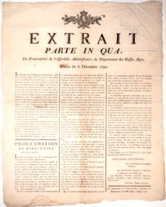 ALPES-DE-HAUTE-PROVENCE. 1791. « Extrait parte in qua, du Procès-Verbal de l’Assemblée Administrative du Département des Basses-Alpes. » « Proclamation du Directoire. Séance du 6 Décembre 1790. » - De l’Imprimerie de J. Guichard, Imprimeur du Département des Basses-Alpes, à Digne 1791. Vignette Royale. Placard (52 x 42) État B
