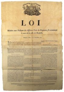 PÊCHE. 1790. BOUCHES-DU-RHÔNE. LOIR-ET-CHER : « LOI relative aux PÊCHEURS des différents ports du Royaume & notamment à ceux de la ville de MARSEILLE » Donnée à Paris le 12 Décembre 1790. « L’Assemblée Nationale, s’étant fait rendre compte des pétitions & mémoires des patrons pêcheurs… ouï ses Comités de Marine, de Commerce & Diplomatique décrète l’interdiction de la « Pêche aux bœufs », la parité des droits avec pêcheurs Catalans, le service des gens de mer français & espagnols, rétablissement du port de CASSIS (13). » Impr. à BLOIS (41), chez Masson, grande Rue, 1791. Placard (67 x 45) Etat A