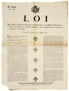 RÉVOLUTION. 1791. ÉTABLISSEMENT DES DIRECTOIRES DE DÉPARTEMENT.. “LOI qui autorise les différents Directoires de Département ou de District y dénommés, à louer ou à acquérir les bâtiments nécessaires à leur établissement, & à y faire les réparations convenables.”. Donnée à Paris, le 15 mai 1791. – Vignette Royale & fleurs de lys. N° 896. (1°) MANCHE. Maison conventuelle des Dominicaines de COUTANCES. 2°) HAUTE-VIENNE. Hôtel de la ci-devant intendance de LIMOGES. 3°) VIENNE. Palais de Justice 4°) PUY-DE-DÔME. Maison des CORDELIERS de CLERMONT. 5°) GARD. Maison des Bénédictins-Clunistes de SAINT-PIERRE. 6°) EURE & LOIR. Maison rue de Barde à JANVILLE. 7°) BOUCHES DU RHÔNE. Maison du doyenné de la collégiale à TARASCON. 8°) Maison du Séminaire de RIEUX.) – Imprimé à PARIS, de l’Imprimerie Royale, 1791. Placard (50 x 38) État B+