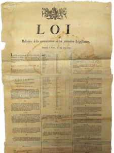 RÉVOLUTION. 1791. LOIR-ET-CHER. « Loi relative à la CONVOCATION DE LA PREMIERE LÉGISLATURE » – Donnée à PARIS le 29 Mai 1791 – « les 83 départements du Royaume enverront au Corps législatif le nombre suivant de Députés (liste des départements et nombre de députés)… les départements qui n’ont pas nommé le Président, l’ACCUSATEUR PUBLIC & le greffier du Tribunal criminel… procéderont à cette élection… ». signé LOUIS & DUPORT – Vignette – Impr. BLOIS (41) chez Masson, grande Rue, 1791. Placard (93 x 45) Etat B (mouillures)