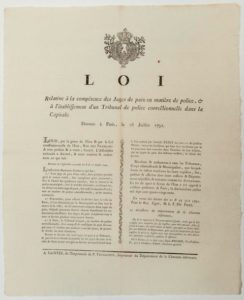 RÉVOLUTION. 1791. TRIBUNAL DE POLICE CORRECTIONNELLE. CHARENTE MARITIME : « Loi relative à la compétence des JUGES DE PAIX en matière de police, & à l’établissement d’un tribunal de Police correctionnelle dans la Capitale. » Donnée à Paris le 18 Juillet 1791. » Le Roi LOUIS XVI & DU PORT. Enregistré au Département de la Charente Inférieure., Saintes (17) le 10 Août 1791. Impr. à SAINTES, de l’Imprimerie de P. TOUSSAINTS. Vignette Royale. Placard (47 x 38) État A.