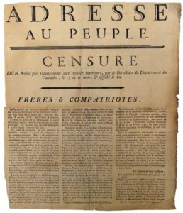 CALVADOS. 1792. (SOCIÉTÉ PATRIOTIQUE DE CAEN) - « ADRESSE au Peuple. CENSURE d’un Arrêté pris relativement aux troubles intérieurs, par le Directoire du Département du CALVADOS, le 17 de ce mois, & affiché le 20. » Frères et Compatriotes.. Les citoyens de CAEN soussignés... - Impr. de CAEN, de l’Impr. Pierre CHALOPIN - Placard (48 x 40) État B+ (marges réduites)