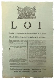 COTON. 1792. COMMERCE. DOUANE : « Loi relative à l’exportation des COTONS en laine & en graine. ». Donnée à Paris le 20 Avril 1792. Imprimerie Guichard, DIGNE (BASSES-ALPES). grande vignette. “1) prononcée le 24 dernier, de la sortie des cotons de laine & en graine, pour l’étranger, est & demeure révoquée par le présent décret. 2) Les cotons sujets au droit de 12 livres par quintal, payeront désormais à leur sortie du Royaume, soit par terre soit par mer, un droit de 50 livres par quintal, poids de marc...” Placard (49 x 33) État A.