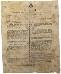 ESSONNE. 1792. « Loi qui ordonne une CÉRÉMONIE NATIONALE pour honorer la mémoire du MAIRE D’ÉTAMPES » - Données à Paris le 16 Mai 1792 - « Honneurs à rendre à la Mémoire de Jacques-Guillaume SIMONEAU, Maire d’Étampes, mort victime de son dévouement à la Loi. » - Petite Vignette, N° 223. Impr. à TULLE (19), de l’Imprimerie de R. CHIRAC, Imprimeur du Département. Placard (42 x 34) Etat B, marbrures.