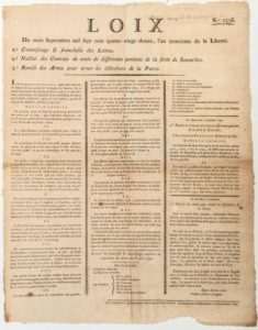POSTE. ARMÉE RÉVOLUTIONNAIRE. 1792. EURE-ET-LOIR. PUY-DE-DÔME. « LOIS du 3 Septembre 1792, An 4 de la Liberté. » : 1° Contreseings et Franchises de Lettres. 2° Nullité des Contrats de vente de différentes portions de la Forêt de SENONCHES (Eure-et-Loir). 3° Remise des Armes pour armer les défenseurs de la Patrie. N° 2558. Publié dans le Département du PUY-DE-DÔME. Placard (52 x 41) Etat B.
