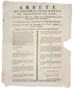 TARN. 1792. (BILLETS DE CONFIANCE). Arrêté du CONSEIL PERMANENT du Département du TARN, concernant les Billets de Confiance émis particulièrement par les Municipalités sans autorisation, du 9 Novembre 1792, l’An 1 de la république Française. » - « Etant informé que plusieurs Municipalités se sont permis sans autorisation de faire fabriquer des Billets de Confiance de valeurs au-dessous de 5 livres, pour être échangés avec des ASSIGNATS de cette somme. Considérant que ces Billets de confiance qui circulent dans plusieurs Municipalités étrangères, y sont un sujet continuel de désordres, par la facilité avec laquelle les gens peu instruits les prennent. Trompés par la ressemblance avec les billets ayant cours forcé, tandis que les gens plus instruits les refusent ensuite… » - Impr. à CASTRES, chez la Veuve ROBERT, 1792. Placard entoilé (47 x 38) État C