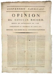 1793 (PROCÈS DU ROI LOUIS XVI). RICORD (Jean François) Conventionnel du VAR. “OPINION du Citoyen RICORD, Député du Département du VAR, concernant le JUGEMENT DE LOUIS XVI, Imprimée par ordre de la Convention Nationale.”. (“... Les Peuples qui nous contemplent, ont la hache levée sur la tête de leurs tyrans, & ils attendent pour frapper, que vous leur en donniez le signal. Ainsi, que le sang du roi coule, & l’univers est libre. Je conclus que Louis XVI peut & doit être jugé, qu’il doit l’être par la Convention Nationale, & dans le plus cour délai possible.”). Impr. à DOUAI (59), chez MARLIER.Placard (66 x 46) État A.