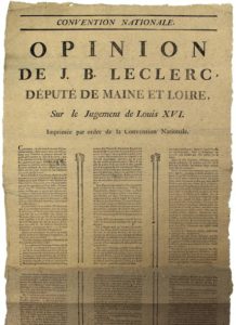 1793 (PROCÈS DU ROI LOUIS XVI). LECLERC (Jean Baptiste) Conventionnel de MAINE-ET-LOIRE (49) – « Opinion de J. B. LECLERC, Député de Maine et Loire, sur le Jugement de Louis XVI.». Imprimé par ordre de la Convention Nationale.” Placard (86 x 35) État A.