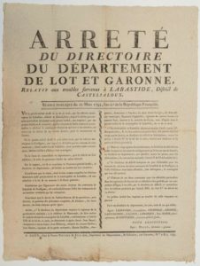 LOT-ET-GARONNE. 1793. RÉVOLTE. « Arrêté du Directoire du Département de Lot-et-Garonne, relatif aux Troubles survenus à LABASTIDE, District de CASTELJALOUX. Séance publique du 12 Mars 1793. » Impr. à AGEN, chez la Veuve NOUBEL & Fils aîné, Imprimeur du Département & Libraires, rue Garonne, N°2 & 3; 1793. Placard (50 x 37,5) Etat A