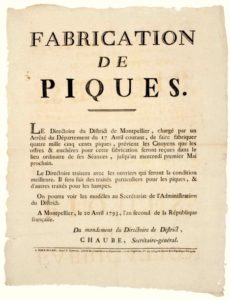 1793. HÉRAULT. « FABRICATION DES PIQUES. » Le Directoire du District de MONTPELLIER (34) chargé par un arrêté du Département du 17 Avril courant, de faire fabriquer 4500 Piques, prévient les Citoyens que les offres & enchères pour cette fabrication seront reçues dans le lieu ordinaire des séances, jusqu’au Mercredi 1er Mai prochain. Le Directoire traitera avec les ouvriers qui feront la condition meilleure. Il sera fait des traités particuliers pour les piques, & d’autres traités pour les hampes. On pourra voir les modèles au secrétariat de l’Administration du District – MONTPELLIER le 20 Avril 1793 – Impr. à MONTPELLIER, chez J.F. TOURNEL père & fils, Imprimeurs du Département, rue de l’Aiguillerie, N°43, 1793, an 2. Placard (45 x 35) État A