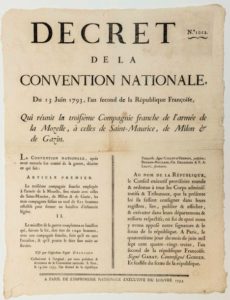 ARMÉE DE LA MOSELLE. « Décret de la CONVENTION NATIONALE, du 13 Juin 1793, qui réunit la troisième Compagnie franche de l’Armée de la Moselle, à celles de Saint Maurice, de Milon & de Gazin. » N°1012. « … les trois Compagnies faisant un total de 821 hommes effectifs pour former un bataillon d’infanterie légère… » A Paris, de l’Imprimerie Nationale Exécutive du Louvre, 1793. Placard (43,5 x 33) Etat A.