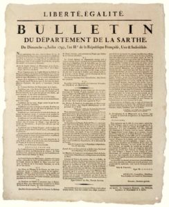 1793. « BULLETIN DU DÉPARTEMENT DE LA SARTHE. Du Dimanche 14 Juillet 1793, An 2. « Le Conseil Général du Département reçoit avec reconnaissance LES DROITS DE L’HOMME & DU CITOYEN, & L’ACTE CONSTITUTIONNEL, qui lui sont remis par les Commissaires du Conseil général du district du MANS. » ; Arrêté du Conseil général de la Sarthe, séance publique du 12 Juillet 1793 ; Lettre du Comité d’Indre-et-Loire, aux Citoyens de la Sarthe ; Seconde Lettre de TOURS (37), du 12 Juillet 1793 ; Le Correspondant de la Municipalité de LA FLÈCHE (72), aux Citoyens du comité de Correspondance du Département de la Sarthe : Nous aprenons que le reste de notre armée à quitté hier la Ville d’ANGERS (49), pour se porter sur la rive gauche de la Loire, où se sont ralliés les Troupes Royalistes… ». Impr. au MANS, chez PIVRON, Imprimeur du Département de la Sarthe. Placard (53 x 43) État A.