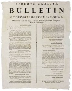GUERRE DE VENDÉE. 1793. SARTHE – Bulletin du Département de Sarthe du 19 Août 1793, An 2 - « ANGERS le 17 août 1793. Lettre des administrateurs du Maine et Loire, à ceux de la Sarthe, qui envoie la Lettre du Général CHALBOS, qui nous annonce une VICTOIRE COMPLÈTE SUR LES REBELLES, en date de NIORT le 15 Août 1793 : « Je viens de recevoir des dépêches de TUNCQ Général, qui m’apprennent le succès des armes de la liberté devant LUÇON ; hier les brigands se présentèrent forts de 40000 hommes. Ces phalanges liberticides ne purent résister à l’impétuosité des Soldats républicains… » - « Lettre des Administrateurs du Département de la Vendée… Lettre des administrateurs des Deux-Sèvres… » - Impr. au MANS, chez PIVRON, Imprimeur du Département de la Sarthe. Placard (45 x 35) État A