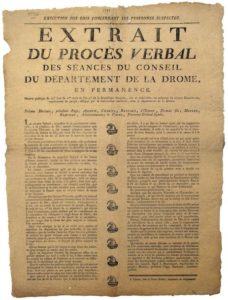 DRÔME. 1793. Exécution des lois concernant les PERSONNES SUSPECTES. Extrait du procès-verbal des séances du Conseil du Département de la Drôme, en permanence  du 29° jour du 1er mois de l’an 2 (20 oct. 1793) – Impr. à VALENCE, chez la veuve Aurel – Bonnets phrygiens. Placard (47 x 35) État A