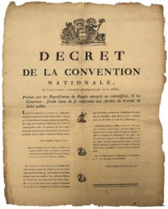 LOIRE. AN 2. COMMUNE-D’ARMES (Nom révolutionnaire de ST-ÉTIENNE) – Décret de la Convention Nationale du 5 Frimaire An 2 (25 Nov. 1793), portant que les Représentants du Peuple envoyés en commission, & les Généraux, seront tenus de se conformer aux Arrêtés du COMITÉ DE SALUT PUBLIC. DALBARADE & GOHIER. Belle vignette de « La République Française » & Bonnets phrygien. Impr. à COMMUNE-D’ARMES, chez Boyer, An 2 - Placard (53 x 42) État A
