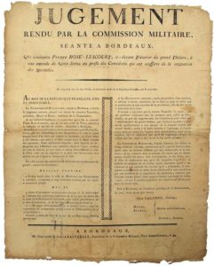 GIRONDE. AN 2. SPECTACLES - JUGEMENT rendu par la Commission militaire séante à BORDEAUX qui condamne Pierre ROSU-LESCOURT, ci-devant trésorier du Grand-Théâtre, à une amende de 6000 livres au profit des Comédiens qui ont soufferts de la stagnation des Spectacles. 5 nivôse an 2 (25 Déc. 1793) - Impr. à BORDEAUX, chez Silva Lafforest, Imprimeur de la Commission Militaire, Place Sainte-Colombe, N° 41. Placard (54 x 43) État B.