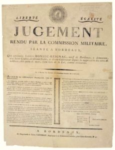 AN 2. GIRONDE. PEINE DE MORT D’UN ARISTOCRATE. « JUGEMENT rendu par la Commission Militaire, séante à BORDEAUX, du 12 Pluviôse An 2 (31 Janvier 1794). Qui condamne Louis MONSEC-REIGNAC, natif de Bordeaux, y demeurant, et à Saint-Loubès, ci-devant noble, se disant Cultivateur depuis la suppression des titres de noblesse, à la peine de mort, étant hors de la Loi, comme Aristocrate. ». Impr. à Bordeaux, chez Silva LAFORREST, Imprimeur de la Commission Militaire, place Sainte-Colombe, N°41. Vignette. Placard (50 x 38) État B (marges réduites)