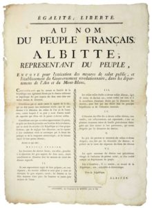 AN 2 (AIN & MONT-BLANC). SÉPARATION DES PRISONNIERS DES DEUX SEXES. « Au nom du Peuple Française, ALBITTE (Conventionnel de la Seine-Inférieure), Représentant du Peuple, envoyé pour l’exécution des mesures de Salut Public, et l’établissement du Gouvernement révolutionnaire, dans les Départements de l’AIN et du MONT-BLANC. ». Fait à CHAMBERY (73) le 12 Ventôse An 2 (2 Mars 1794). « Considérant que les mœurs et l’intérêt de la République sont également blessés par la réunion indécente et impolitique des gens suspects des deux sexes dans une même maison de détention. Considérant que ce serait outrer la rigueur de la Loi,… que de condamner à la détention les enfants de l’un et l’autre sexe, contre lesquels il ne peut y avoir d’autres motifs de reproche que d’être nés de parents ci-devant nobles. . Considérant que les enfants appartiennent à la Patrie et qu’ils ont droit aux bienfaits de la Révolution. ; que se serait les arracher à la République…, que de négliger leur éducation, ou les exposer à être totalement viciés et corrompus par la fureur des préjugés et de la vengeance aristocratique, en les laissant auprès de leurs parents détenus ; arrête… » – Impr. à Chambéry, de l’Imprimerie de GORRIN, père et fils. Placard (47 x 33) État B.