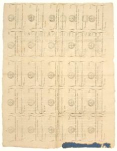 AN 2. ASSIGNATS. LOTERIE. « Décret de la convention Nationale, du 17 Ventôse An 2 (7 Mars 1794), contenant une instruction sur les moyens de vérifier les nouveaux Assignats. ». N°2226. De l’imprimerie des administrations Nationales, an 2. au verso planche de Billets de Loterie ; « LOTERIE DES ENFANTS-TROUVÉS à 4 sols le Billet. » Placard (53 x 42) État A