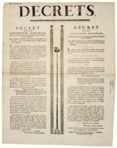 RHÔNE. 1794. COMMUNE-FRANCHE, Nom Révolutionnaire de VILLEFRANCHE (69) – Double « DÉCRETS » de la Convention Nationale : « 1°) Qui substitue le Bœuf salé & le lard au beurre salé & au fromage, pour l’approvisionnement des villes & places fortes assiégées. » « 2°) Qui suspend l’exécution de l’Arrêté du Département de PARIS, relatif aux locations des jardins de Domaines Nationaux. » . Commune Franche, le 27 Germinal An 2 (16 Avril 1794). Impr. à COMMUNE-FRANCHE, chez le Sans-culotte DESTEFANIS, Imprimeur du Département du RHÔNE. Placard (48 x 37) État A.