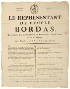 GIRONDE. 1794. “Le Représentant BORDAS en Mission dans les Départements du BEC D’AMBÈS, de la CHARENTE & de la DORDOGNE.” (En-tête, vignette). du 7 Pluviôse An 2 (26 avril 1794). « ... Les Rouliers, Bouviers & Bateliers se refusent d’adhérer à leurs réquisitions, pour la conduite des bois, charbons, fers, vins & autres objets nécessaire au service publics... ». Impr. à BORDEAUX, chez la veuve J.B. CAVAZZA, Rue des Ayres – (Pardoux BORDAS est Conventionnel de la HAUTE-VIENNE). Placard (40 x 32) État A.