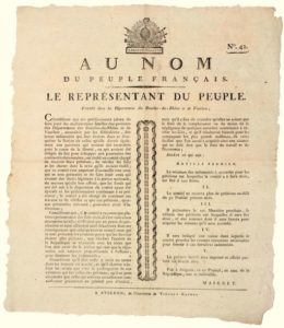 AN 2. MAIGNET le Représentant du Peuple, envoyé dans les Départements des BOUCHES-DU-RHÔNE et du VAUCLUSE . Fait à AVIGNON (84) le 10 Prairial An 2 (29 Mai 1794) – arrêté sur le Minimum des indemnités à accorder pour les pétitions. « Considérant que ses prédécesseurs jaloux de faire jouir les malheureuses familles des patriotes des Départements des Bouches-du-Rhône et de Vaucluse, assassinés par les fédéralistes, des justes indemnités qui leur étaient dues et d’acquitter la Nation de celles qu’elle devait également aux Patriotes qui avaient été incarcérés pour la cause de la Liberté… » – Vignette « Liberté, Egalité. ». Impr. à AVIGNON (84), de l’Imprimerie de Vincent Raphel. (Étienne Christophe MAIGNET est Conventionnel du PUY-DE-DÔME). Placard (44 x 38) État A