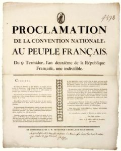 9 THERMIDOR AN 2. ARRESTATION D’HENRIOT LE MAIRE DE PARIS. Décret de la Convention Nationale, du 9 thermidor An 2 (27 Juillet 1794) . « La Convention Nationale a mis hors de la Loi HENRIOT, le Maire de PARIS, & tous les membres du Conseil Général de la Commune qui se sont déclarés en rébellion, & qui ont reçu dans leur sein les individus décrétés d’arrestation (ROBESPIERRE) dans ses séances de ce jour. Tout le ralliement des Autorités constitués & de la Force publique, est à la Convention Nationale. ». Pour copie conforme, Les Administrateurs composant le Directoire du District de LILLE (59) – de l’Imprimerie de Léonard DANEL. (Le 9 thermidor, la Convention décrète l’Arrestation de ROBESPIERRE et de ses Partisans, La Commune de PARIS se déclare en insurrection.) - Placard (54 x 43) État A