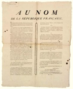 AN 2. MISE EN LIBERTÉ DES DÉTENUS. Arrêté de PAGANEL Représentant du Peuple, Député de la Convention Nationale près les Départements du LOT, DE LOT-ET-GARONNE, HAUTE-GARONNE, et autres circonvoisins en séance à TOULOUSE, relatif aux Détenus . Date manuscrite au verso, 11 Thermidor An 2 (29 juillet 1794). « Considérant que les mesures de Sûreté générale et de salut public n’ont pas dû faire oublier les sentiments de la justice et de l’humanité, qu’il est du devoir des représentants du peuple de protéger de l’innocence, d’éclairer l’erreur et de ne punir que le crime. » « Les Agents Nationaux des districts dans les départements de Lot-et-Garonne, de Haute-Garonne, du Lot, de l’Ariège et du Tarn,… feront dressé dans tous les Comités de Surveillance le tableau exact des personnes arrêtées dans chaque Commune, des motifs de leur arrestation, de leur qualité et profession, soit dans l’ancien, soit dans le nouveau régime… La liste de toutes personnes mises en liberté, ainsi que celles qui resteront en état d’arrestation ou de réclusion, sera envoyée au Comité de Salut Public de la Convention Nationale. » – Impr. à RODEZ (12), chez DEVIC, Imprimeur du Département de l’Aveyron. (Pierre PAGANEL (1745-1826) est Conventionnel du LOT-ET-GARONNE.) Placard (42 x 37) État A