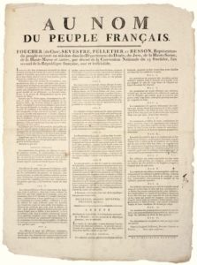 AN 2. FOUCHER (du CHER), SEVESTRE, PELLETIER et BESSON, Représentants du peuple envoyés en mission dans les Départements du DOUBS, du JURA, de la HAUTE-SAÔNE, de la HAUTE-MARNE et autres, par décret de la Convention Nationale du 13 Fructidor An 2 (30 août 1794). Au nom du Peuple Français. – Contre les abus de l’exécution l’Arrêté du Comité de Salut Public voulant diminuer l’encombrement des hôpitaux militaires, et procurer aux Défenseurs de la Patrie, la satisfaction de se faire traiter dans leurs familles. (Suit l’arrêté du Comité de Salut Public en 12 articles) « Art. 12 « les disposition de cette Arrêté ne sont pas applicables aux galeux. » Barère, Billaud-Varenne et Carnot. De l’Imprimerie de BRIOT. Placard (61 x 45) État A