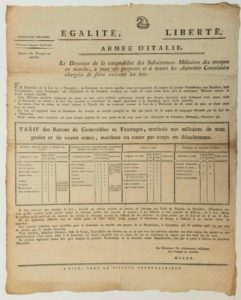 ARMÉE D’ITALIE. 1794. SUBSISTANCES MILITAIRES. Section des Troupes en marche. « TARIF DES …