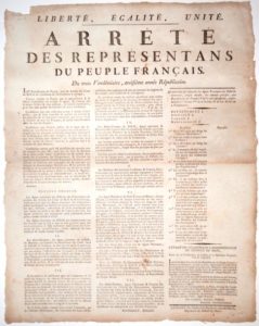SARTHE. AN 3. CHOUANS & INSURGÉS – Arrêté des représentants du Peuple Français, BOURSAULT & BOLLET, du 3 Vendémiaire an 3 (24 sept 1794), relativement à l’instruction des Citoyens, & à la publication des lois. « Il se rendront de préférence dans les communes où les Chefs des brigands, des Chouans, & autres ennemis intérieurs avaient fanatisé & perverti l’esprit… ». Suivi de l’arrêté fait en conseil général, au MANS, le 26 Vendémiaire an 3 – Impr. au MANS, de l’Imprimerie Nationale, chez PIVRON, Imprimeur du District du Mans - Placard (54 x 42) État A